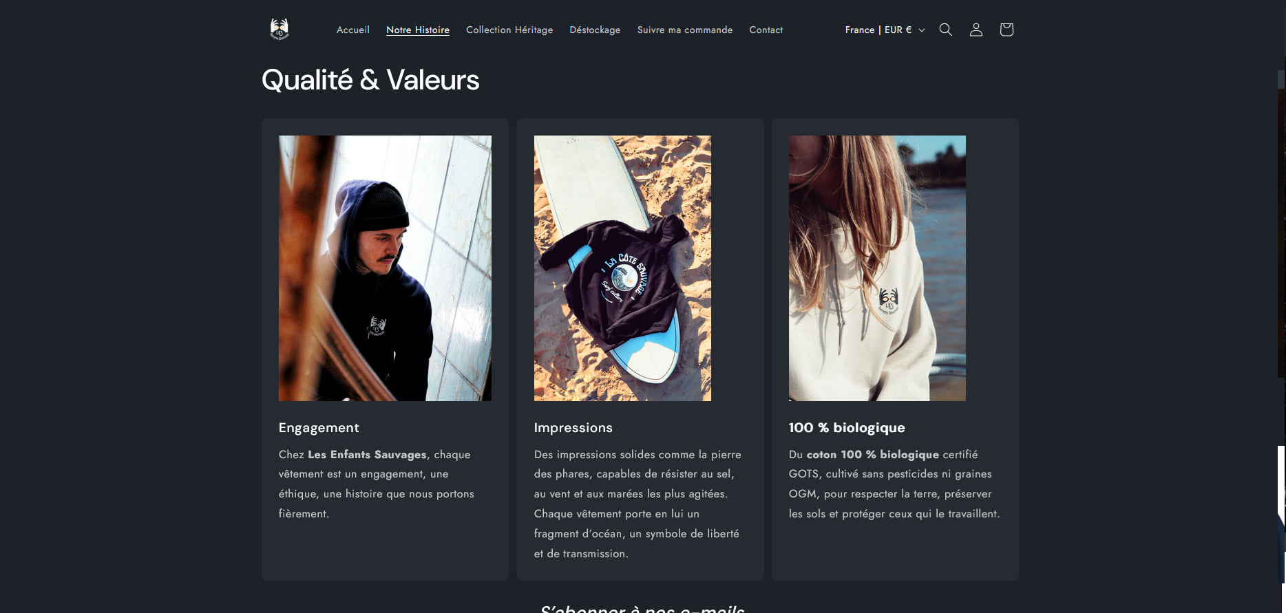 Face à un marché du lifestyle et du vêtement de surf saturé, la marque "Les Enfants Sauvages" devait établir une proposition de valeur unique : incarner l'esprit brut, authentique et la liberté des côtes indomptées, tout en mettant l'accent sur la qualité et la durabilité de ses pièces. Le défi était de traduire cette philosophie en une identité visuelle et une expérience e-commerce qui transmettent un sentiment de communauté et d'héritage.