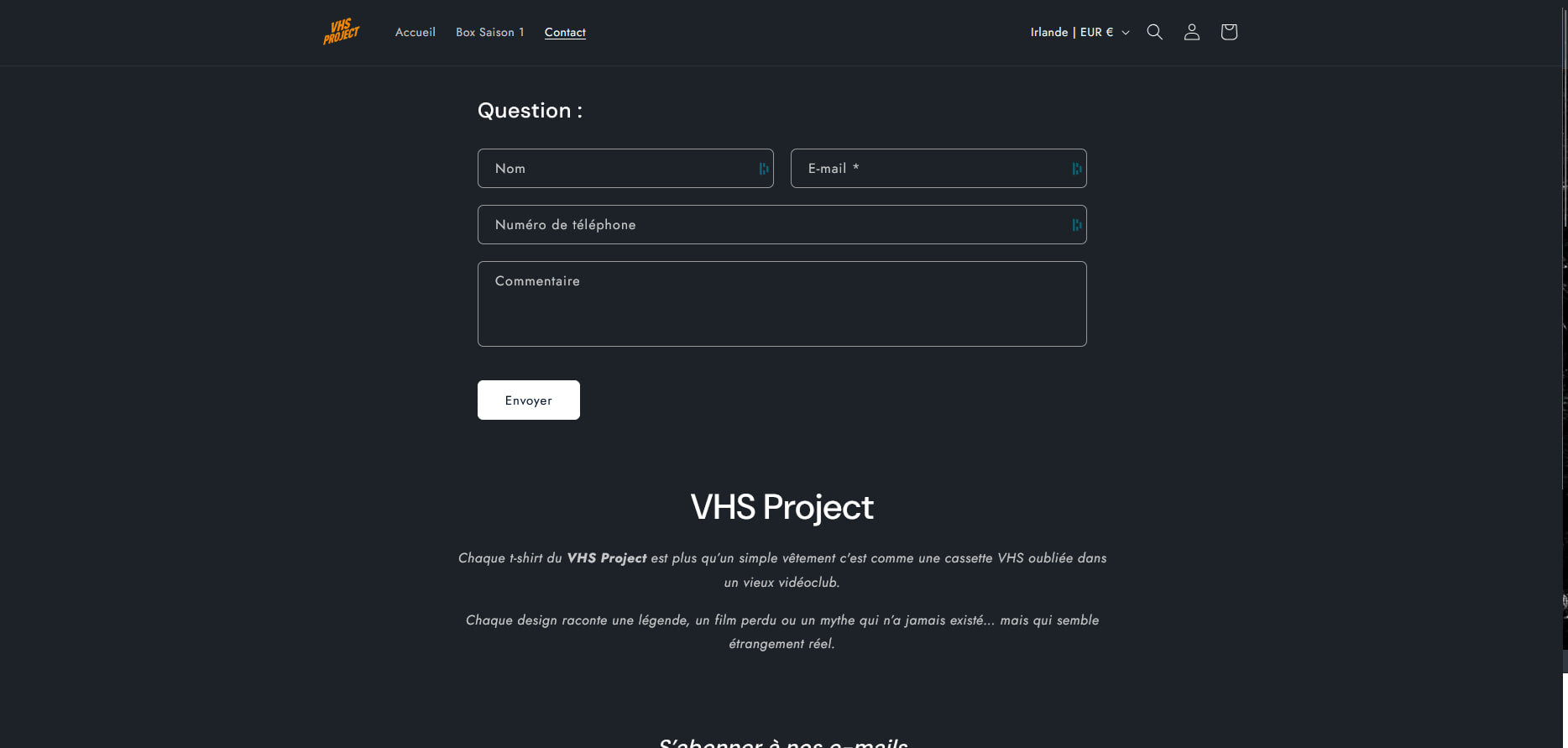 VHS Project est né de la volonté de créer une marque d’apparel et de lifestyle qui va au-delà du simple produit. L'objectif était de capturer l'esthétique brute et nostalgique de l'ère analogique et de la vidéo cassette (VHS) pour la transposer dans une identité visuelle moderne et percutante, tout en établissant une plateforme e-commerce simple et performante.